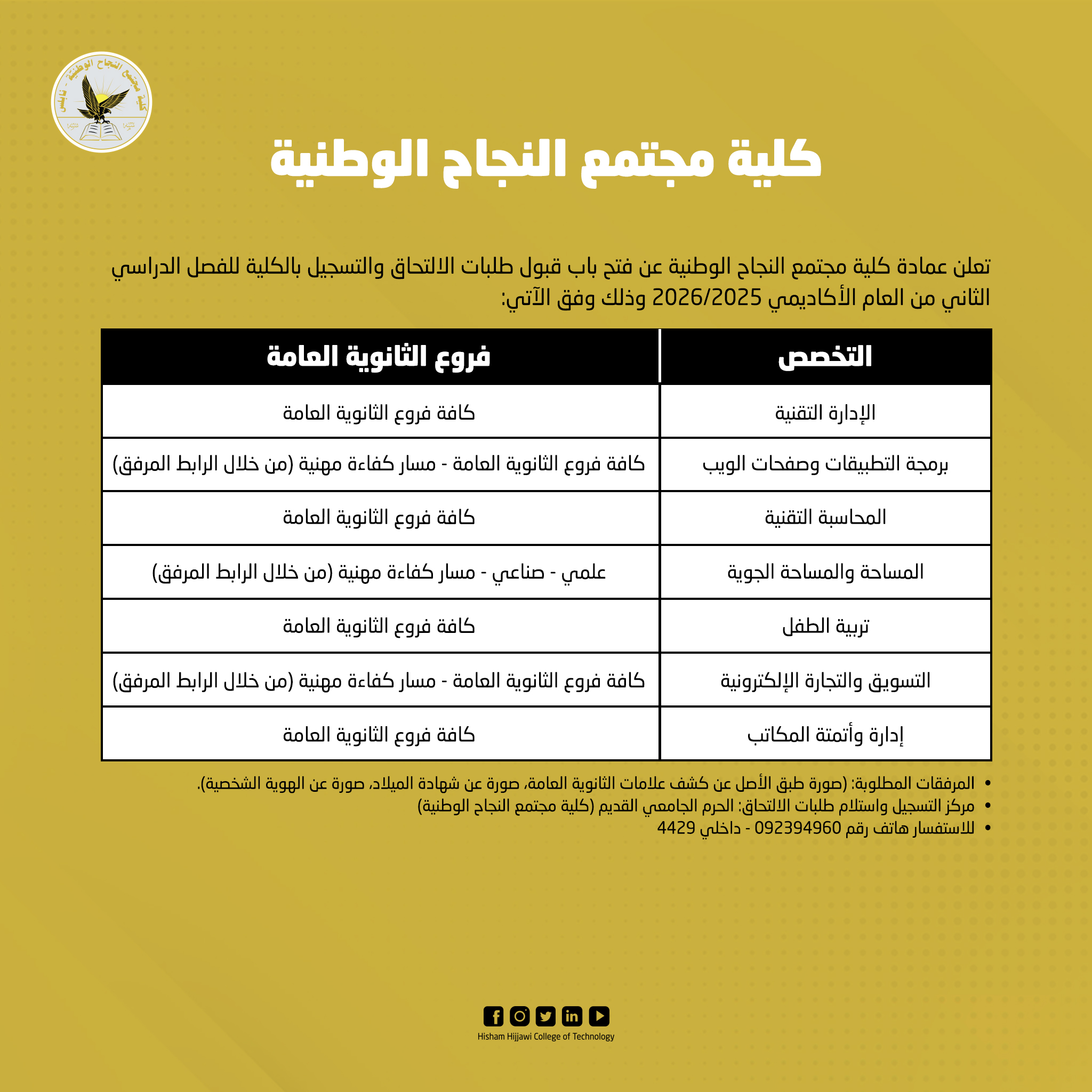 قبول طلبات الالتحاق والتسجيل للعام الاكاديمي 2025-2026 - كلية مجتمع النجاح الوطنية